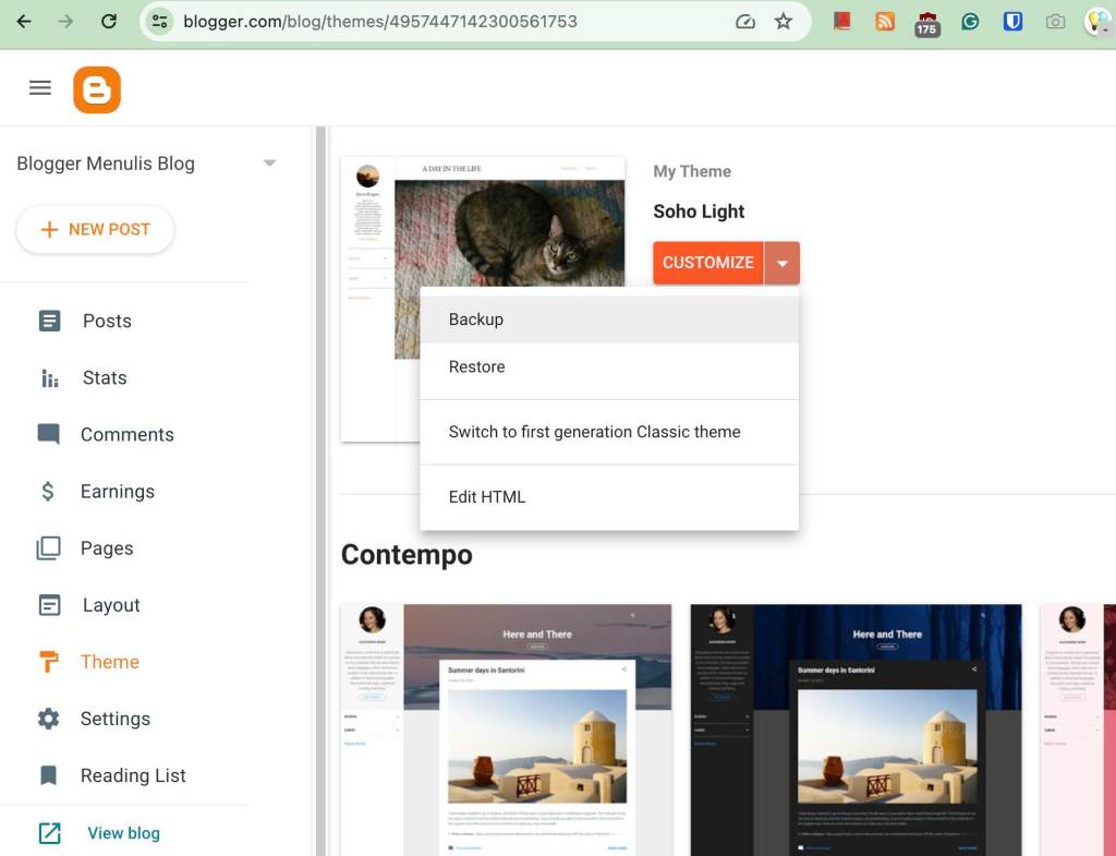 Seperti sudah saya sebutkan, jika ingin tampilan blog nya sama persis, ada baiknya kita menyimpan cadangan theme atau template dari blogspot yang kita gunakan. Caranya